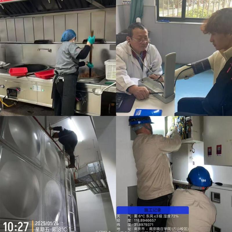 寒假期间,莫愁校区办工作人员坚守本职岗位,每日轮流值班,并安排物业人员对4号楼及校园其他楼宇内的各项基础设施设备、有无漏水等情况进行每日检查并每日上报值班日志,遇紧急情况及时上报;做好寒假期间2024年度校党委领导班子民主生活会、财务处(基础教育专业委员会)项目研讨会、校领导春节慰问等相关会议、活动的后勤保障;做好开学前的准备工作。监督物业做好食堂恢复供餐的准备工作以及各项设施设备的全面排查和维修工作,全力确保新学期开学工作有条不紊地进行。