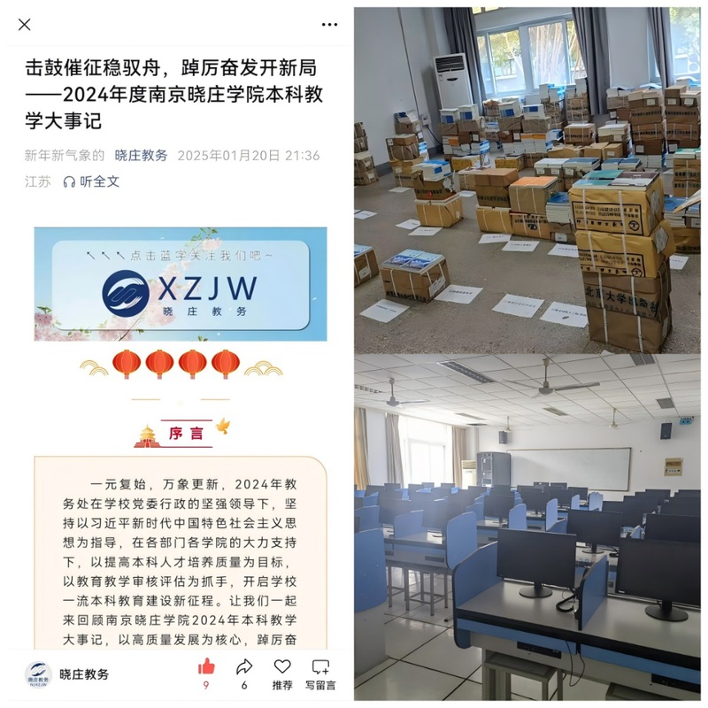 寒假期间,教务处立足全局、统筹安排,认真回顾总结上一年度教学工作,同时部署新学期教学工作,确保教学工作有序开展。深入总结2024年教学工作,从教育教学审核评估、专业建设、课程教材建设、教学改革成果、实践教学、协同育人、双创教育、教学管理、数智赋能、制度建设等十个方面形成教学大事记并在晓庄教务公众号发布。聚焦新学期开学部署。思考教学计划,初步拟定2025年教学工作要点。为了新学期教学工作有序开展,提前筹备教材发放、课表安排、选课安排以及教室、实验室等资源保障,做好开学初二级学院走访以及校院两级共同巡课事宜。