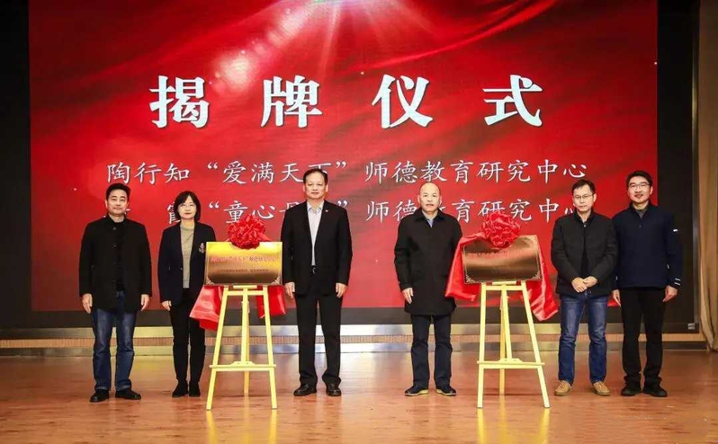 活动中,张志华、杨菲菲、潘东标共同为“陶行知‘爱满天下’师德教育研究中心”揭牌。张晓东、朱征、张恒柱共同为斯霞“童心母爱”师德教育研究中心揭牌。“陶行知‘爱满天下’师德教育研究中心”的建立,标志着对陶行知先生教育思想,特别是其师德思想的研究与实践进入了协同发力、系统推进的新阶段,为传承教育家精神、强化新时代师德师风建设构筑了高位平台。我校作为陶行知先生教育事业的继承者和发扬地,将在此研究中心发挥关键作用。