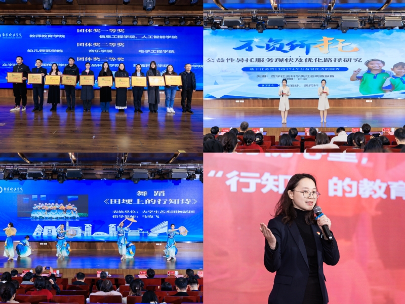 成果展示环节亮点纷呈。文学院第十九届“挑战杯”全国大学生课外学术科技作品竞赛获奖项目团队学生代表,基于对江苏省13市174个公益暑托点的深入调查,系统分析了服务现状,并提出切实优化建议;第五届江苏高校团干部思政技能大比武获奖者,幼儿师范学院团委书记史剑秋以“何以为‘岸’”为题,通过杨瑞清的教育坚守、黄文秀的时代选择等生动案例,阐释了什么是真正的“上岸”;大学生朗诵团带来诗朗诵《英雄》,致敬那些在民族记忆与时代征程中闪耀的英雄精神,展现了跨越时空的精神传承与信仰力量;大学生舞蹈团带来古典舞《田埂上的行知诗》,以优美舒展的肢体语言,生动表现了教育耕耘的质朴情怀与行知精神的时代传承;大学生流行乐团演绎歌曲《新青年》,以青春昂扬的旋律和饱满的演唱,展现青年一代接续奋斗、勇毅前行的精神风貌。