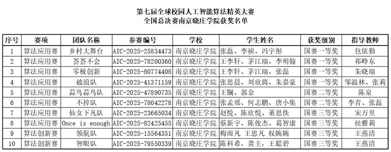 近日,2025年第七届全球校园人工智能算法精英大赛国赛顺利落幕。经过近6个月的精心备战,我校信息工程学院、人工智能学院晋级国赛的10支参赛团队表现优异,斩获一等奖4项,二等奖2项,三等奖4项,取得该项赛事历史最好成绩,获奖层次和数量位于同类院校前列。