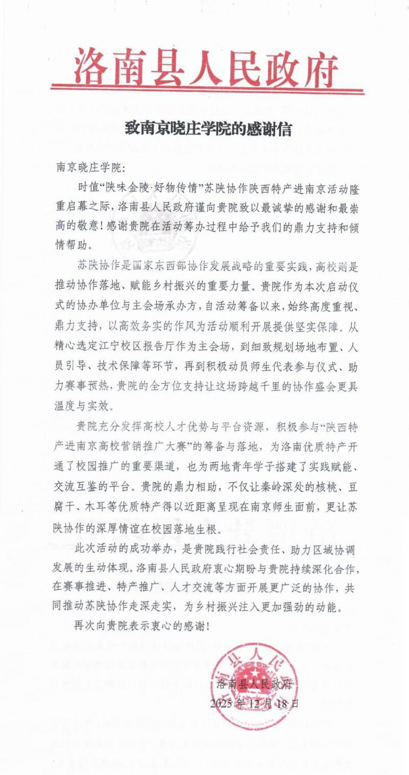 近日,我校收到陕西省洛南县人民政府发来的感谢信,信中高度评价并诚挚感谢我校在“陕味金陵·好物传情”陕西特色产品进南京推广活动中的辛勤付出和突出贡献。