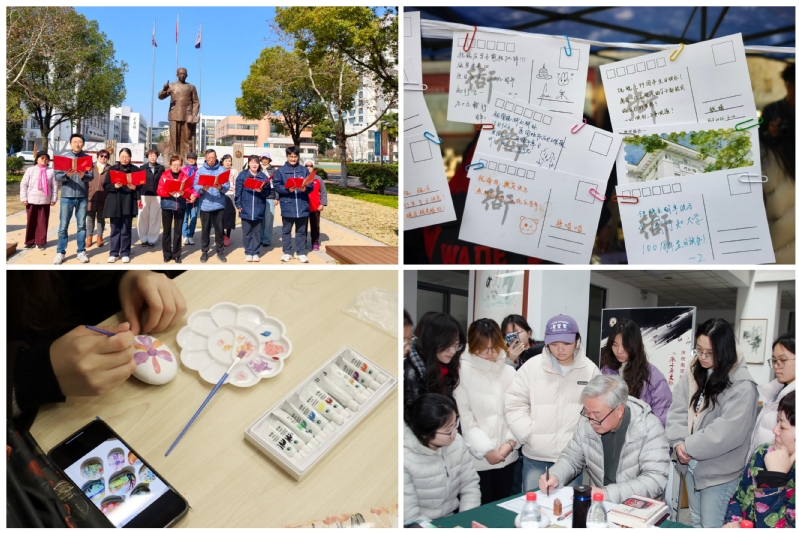 商学院特邀画家、诗人、国家一级作家万里君女士,中国殷商文化学会甲骨文书法专业委员会委员庞跟泽担任主讲嘉宾,开展“承千年文脉,启万里新程”篆画同风艺术讲座。两位嘉宾向现场师生、商学院赠送了艺术佳作。随后,万里君以“行知美育与AI时代——中国画传承的时代使命”为题展开讲座;庞跟泽则带来了篆刻艺术主题分享和姓名印创作现场示范。此外,商学院还举办了第四届“读书天”迎校庆环校健身跑。40余名师生代表手持小国旗,从合一广场出发,途经图书馆、文科楼、体育馆、学生公寓等地,感受校园春景,体悟百年底蕴。