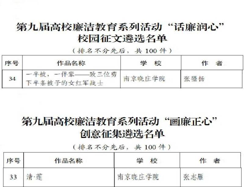 近日,教育部办公厅公布第九届高校廉洁教育系列活动结果。我校美术学院教师张志雁作品《清·莲》入选第九届高校廉洁教育系列活动“画廉正心”创意征集遴选名单;文学院学生张曌扬作品《一半被、一伴辈——致三位剪下半条被子的女红军战士》入选第九届高校廉洁教育系列活动“话廉润心”校园征文遴选名单。