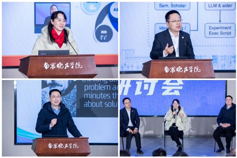 王本余介绍了南京晓庄学院发展历程以及学校服务南京所做出的努力和成效。他指出,人工智能不仅改变了教学方式,也为教育内容、教学管理乃至教育评价带来了革命性的变化。在此背景下,加强人工智能通识课程建设,对于培养具有创新精神和实践能力的高素质人才,具有重要的战略意义。本次研讨会邀请到了南京大学计算机基础教学部副主任金莹教授、南京邮电大学教务处处长沈建华教授,南京师范大学人工智能学院副院长陈波教授等多名专家学者围绕高等教育人工智能通识课程的教学组织与实施策略、教学资源平台与高质量教材建设等方面进行了充分交流与探讨。金莹教授从ChatGPT带来的教育转型和教学改革,谈到南京大学的“1+X+Y”三层次人工智能通识课程体系;沈建华教授从AI通识课程国内外探索,谈到了南京邮电大学的人工智能通识课程的分类教学;陈波教授则讲述了AIGC支持下的苏格拉底提问。会议现场交流氛围浓厚,各位学者畅所欲言。
